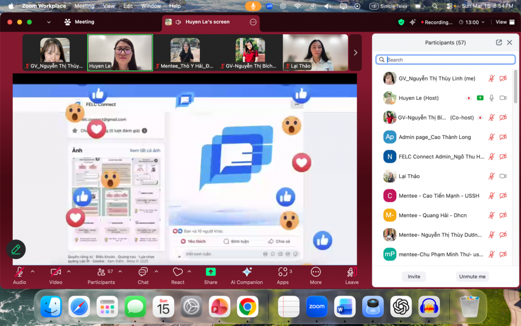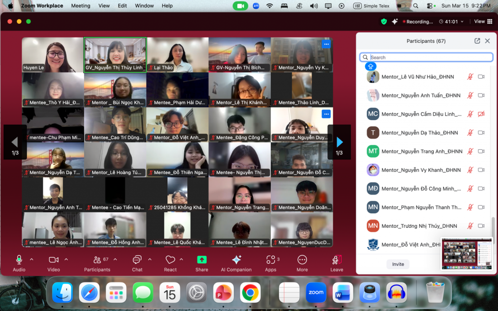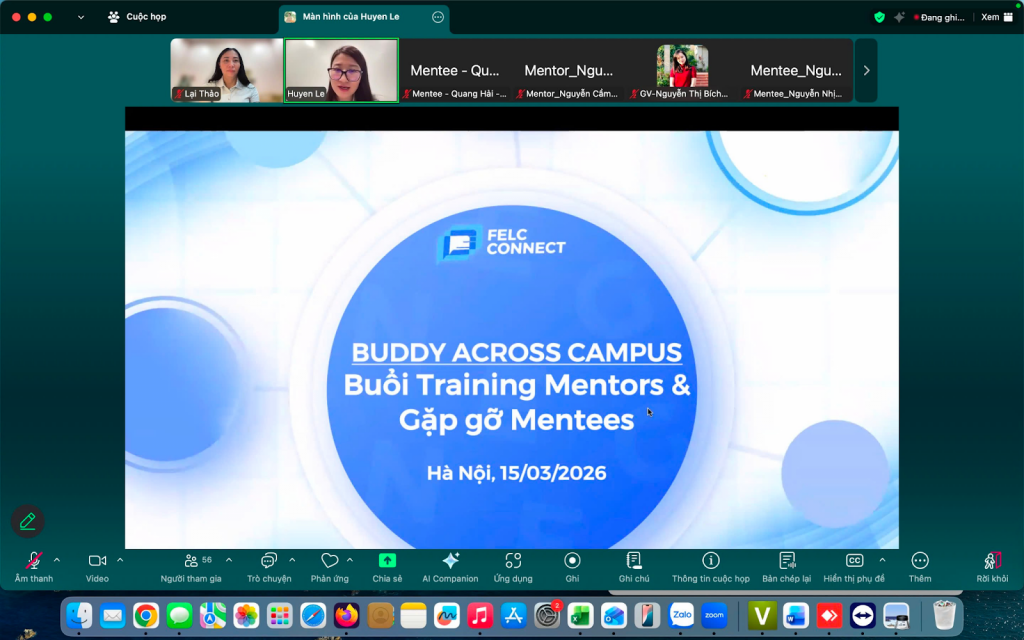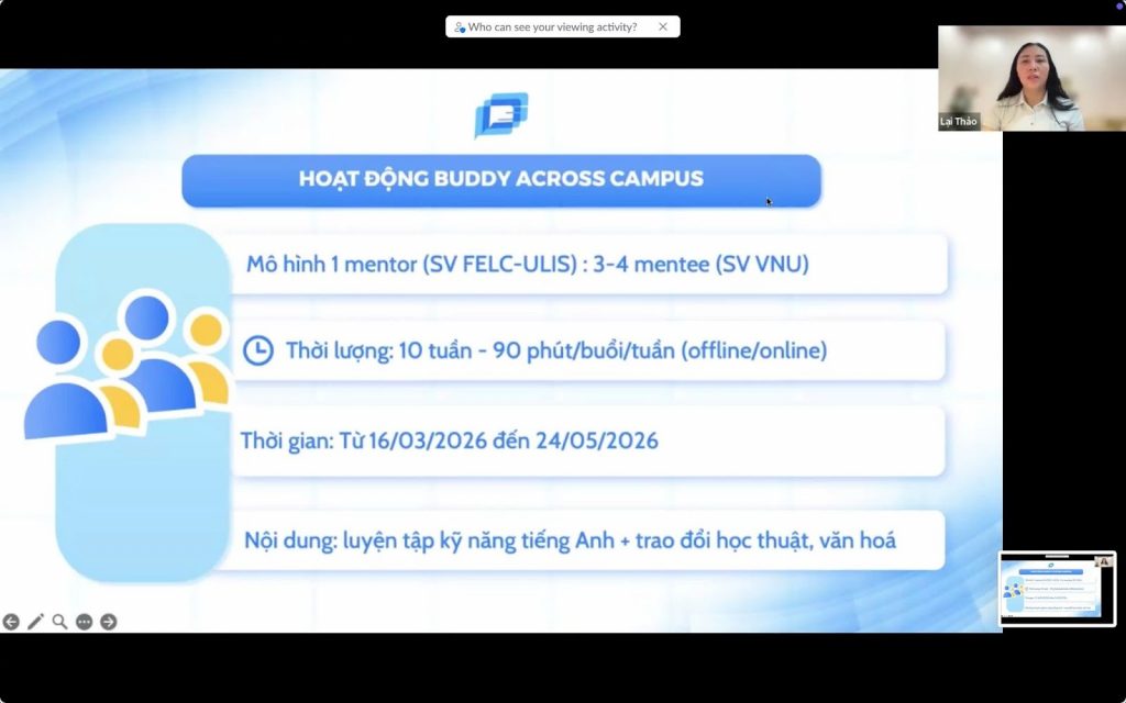Tối ngày 15/3/2026, buổi Training Mentors và Gặp gỡ Mentees thuộc chương trình Buddy Across Campus học kỳ II năm học 2025–2026 đã diễn ra thành công qua nền tảng Zoom Meeting. Chương trình do FELC Connect – kênh kết nối sinh viên thuộc Khoa Ngôn ngữ và Văn hoá Anh, Trường Đại học Ngoại ngữ – ĐHQGHN tổ chức, với sự tham gia của các giảng viên trong khoa cùng đông đảo sinh viên đến từ các đơn vị thành viên của ĐHQGHN.