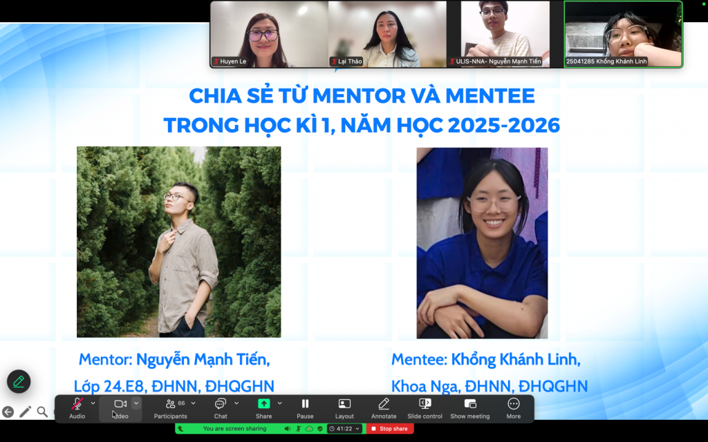 Chương trình cũng mời mentor Nguyễn Mạnh Tiến (lớp 24.E8, ULIS) và mentee Khổng Khánh Linh (Khoa Nga, ULIS) – những sinh viên đã tham gia hoạt động ở học kỳ I – chia sẻ trải nghiệm. Theo Tiến, quá trình mentoring mang lại nhiều kỷ niệm đáng nhớ và giúp bản thân học hỏi thêm về cách kết nối và hỗ trợ người học. Trong khi đó, Khánh Linh cho biết chương trình không chỉ giúp cải thiện kỹ năng tiếng Anh mà còn mang đến những phương pháp học thú vị như luyện nghe qua phim ảnh, âm nhạc, đồng thời giúp sinh viên kết nối với nhiều bạn bè mới trong ĐHQGHN.
