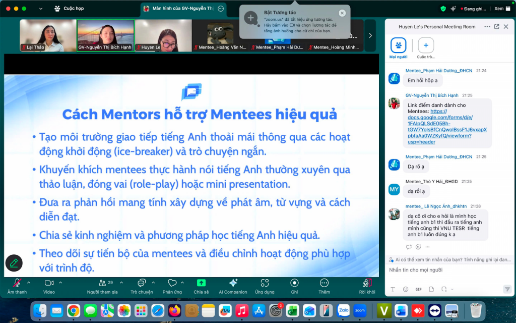Trong phần cuối của chương trình, cô Nguyễn Thị Bích Hạnh đã triển khai training dành cho các mentor, tập trung vào vai trò của mentor, phương pháp hỗ trợ mentee hiệu quả và giới thiệu khung chương trình 10 buổi mentoring trong học kỳ.