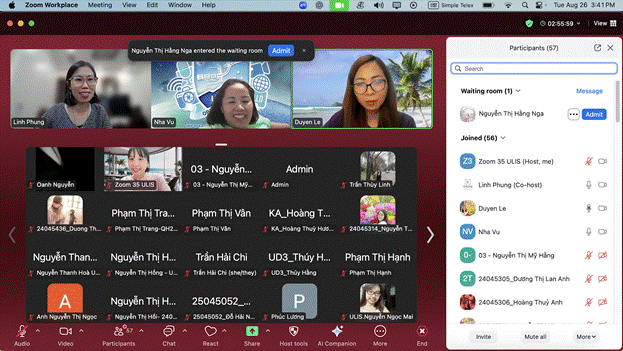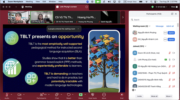 Chiều 26/8/2025, seminar học thuật với chủ đề “Designing Task-Based Interactions with AI Chatbots for Language Development” đã diễn ra trực tuyến qua Zoom và nhận được sự quan tâm lớn của cộng đồng ULIS. Tại thời điểm cao nhất, buổi chia sẻ ghi nhận hơn 150 người tham dự, bao gồm giảng viên, học viên cao học và nghiên cứu sinh từ nhiều đơn vị trong Trường.