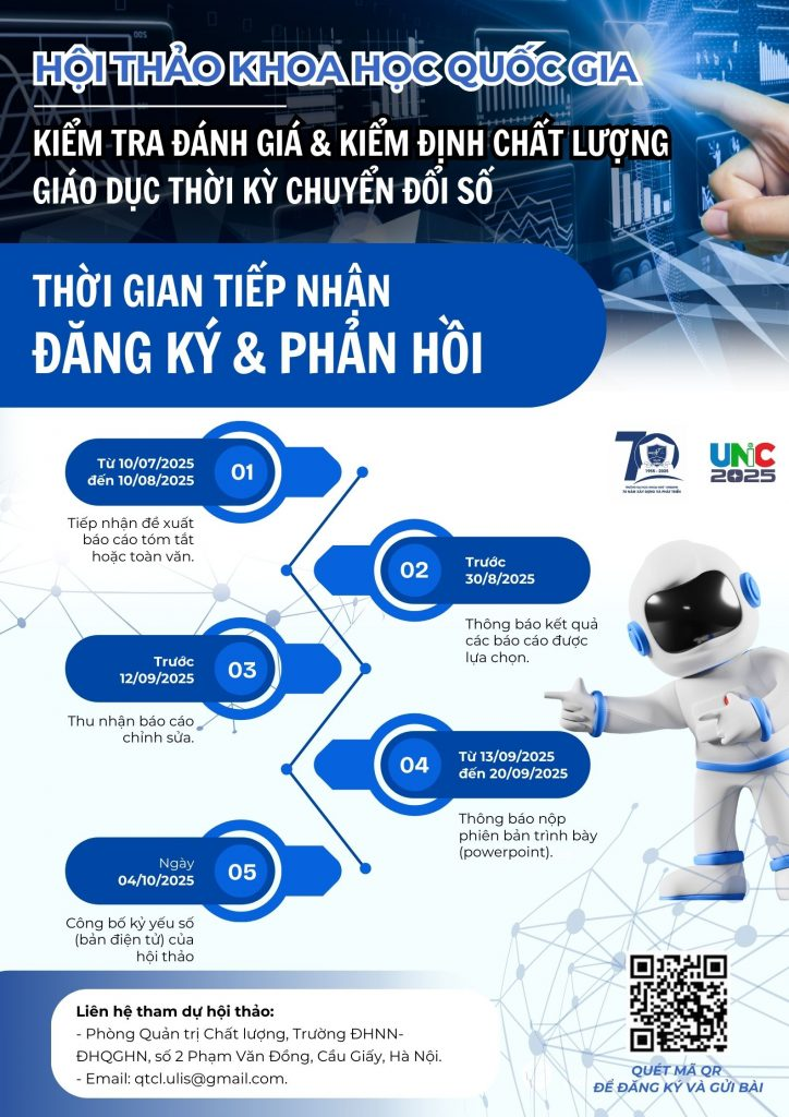 Hướng tới kỉ niệm 70 năm ngày thành lập Trường Đại học Ngoại ngữ, Đại học Quốc gia Hà Nội và nhằm chia sẻ kết quả nghiên cứu và kinh nghiệm trong kiểm tra đánh giá và kiểm định chất lượng trong giáo dục giai đoạn chuyển đổi số, Trường ĐHNN, ĐHQGHN trân trọng thông báo và kính mời các nhà khoa học, giảng viên, giáo viên, học viên sau đại học và các cá nhân quan tâm gửi bài và đăng ký tham dự Hội thảo khoa học với chủ đề “Kiểm tra đánh giá và kiểm định chất lượng giáo dục thời kỳ chuyển đổi số” trong khuôn khổ chuỗi Hội thảo Quốc gia “Nghiên cứu và giảng dạy ngoại ngữ, ngôn ngữ và quốc tế học tại Việt Nam” (UNiC 2025).