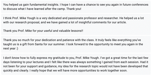 Trong phần chia tay đầy xúc động, nhiều học viên đã để lại lời nhắn gửi dành cho GS. Mike Yough, thể hiện sự trân trọng và biết ơn với những bài giảng tâm huyết, những góp ý mang tính định hướng và niềm cảm hứng ông đã truyền tải.