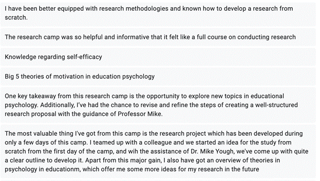Bên cạnh đó, các học viên cũng chia sẻ nhiều nhận xét sâu sắc về những giá trị học thuật mà họ đã tiếp thu được sau trại hè.